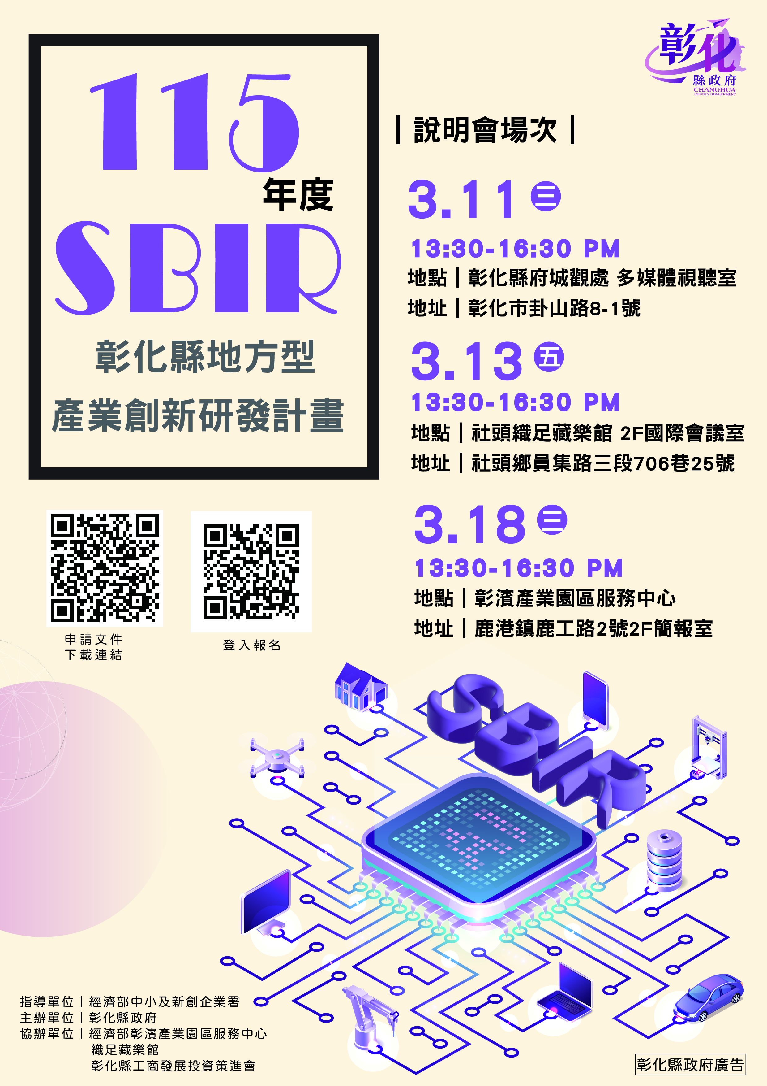 新聞焦點 彰化縣115年度地方型SBIR 4月正式啟動, 3場說明會巡迴開講,助中小企業加速轉型升級 發布日期 2026/01/29~2026/04/30 | 發佈單位: 經濟暨綠能發展處產業發展科 | 發佈日期: 葉小姐 7531471 | 更新日期 2026/01/28 | 瀏覽人數: 95人 為推動在地產業轉型、激發創新能量,115年度「地方產業創新研發推動計畫(地方型SBIR)」將於4月1日正式受理申請。縣府今年持續編列3,000萬元經費,並結合經濟部補助資源,形成穩定且具規模的研發支持後盾,全力協助縣內中小企業提升競爭力。為協助業者精準掌握申請流程與計畫書撰寫重點,將自3月中旬起,於彰化市、社頭鄉及鹿港彰濱工業區辦理3場提案說明會,聚焦實務操作與審查重點解析,協助企業有效爭取最高額度補助經費。 彰化縣長王惠美表示,彰化向來是台灣中小企業的重要基地。自113年度擴大辦理地方型SBIR以來,已展現明確成效,114年度更吸引103家廠商提出申請,共核定62家,總核定補助經費4,797萬1,000元,帶動企業投入7,800萬元,顯示企業對創新研發投入意願持續升溫。115年度將針對數位轉型、自動化與智慧化、能源轉型(綠能)、樂齡產業及新創事業等關鍵領域提供加分誘因,引導企業對準市場趨勢與減碳發展方向,在創新路上站穩腳步。 縣府經濟暨綠能發展處表示,為持續推動「聯合申請」機制,鼓勵企業透過上下游或跨域合作方式共同提案,放大研發綜效。去年有3案6家廠商聯合申請,全數提案成功獲得補助,實證「合作型創新」的可行性與效益。單一企業最高補助金額100萬元,兩家廠商聯合申請,補助上限可提高至200萬元。透過資源整合與風險分攤,不僅可加速技術落地,也有助於建立長期穩定的產業夥伴關係。 為了協助廠商了解計畫申請流程與撰寫要點,經綠處將辦理3場提案說明會,115年3月11日(三)於本府城觀處多媒體視聽室、3月13日(五)在社頭織足藏樂館 2 樓國際會議室及3月18日(三)彰濱產業園區服務中心。凡設立於彰化縣且符合中小企業認定標準(實收資本額一億元以下或僱用員工數未滿 200人)之廠商皆可提案,申請期間自115年4月1日起至4月30 日下午5時止,申請文件請郵寄或親送至「彰化縣政府經濟暨綠能發展處產業發展科」,洽詢服務專線:04-7531471。申請資料下載:https://reurl.cc/EbNdGn 或於縣府首頁「熱門諮詢」區塊點選「彰化SBIR」連結相關申請資訊。