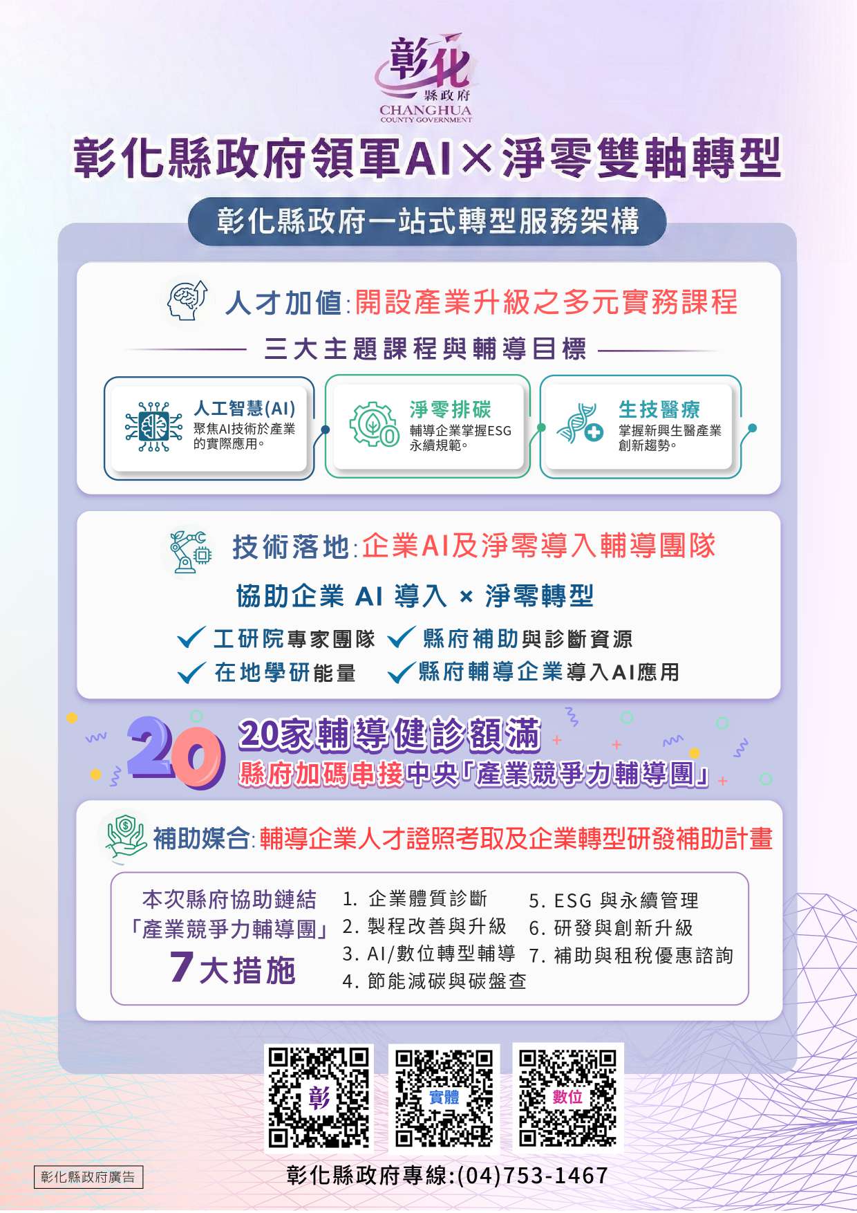 新聞焦點 彰縣府攜手工研院助企業轉型 鏈結中央提供「產業競爭力輔導團」支援 發布日期 2026/03/23~2026/04/23 | 發佈單位: 經濟暨綠能發展處 | 發佈日期: 陶先生 7531463 | 更新日期 2026/03/03 | 瀏覽人數: 57人 面對全球經貿變局、AI浪潮與淨零轉型,彰化縣長王惠美縣府團隊持續加速產業升級,宣布啟動「AI淨零創新產業學院」2.0。以「人才加值、技術落地、補助支援」三位一體模式,協助縣內中小企業導入AI與淨零策略,提升競爭力與產業韌性。並積極鏈結中央資源提供「產業競爭力輔導團」支援7大支援措施。 今年為推動「彰化AI淨零創新產業學院」第2年,縣府超前部署,結合工研院與在地學校,提供人才培育及「AI 淨零診斷」服務。本年度方案以課程診斷補助媒合3大措施:包括一、開設產業升級多元課程:聚焦AI應用、淨零碳排、生技醫療等領域,開設碳盤查、節能技術及跨域課程。二、企業AI及淨零導入輔導:整合工研院與彰師大顧問,至少為20家廠商進行企業診斷,找出「減碳熱點」並提出AI工具導入建議。三、輔導企業人才證照考取及企業轉型研發補助:引導業者運用補助協助企業人員考取iPAS證照,降低AI轉型成本。 本年度企業AI及淨零導入輔導響應踴躍,目前已有20家企業報名額滿,為擴大服務能量,縣府持續扮演資源整合樞紐,鏈結經濟部產發署推動「產業競爭力輔導團」7大支援措施,包含 AI 數位轉型、AI人才培育、技術升級輔導、金融支持、海外市場拓展、ESCO 節能診斷及勞動力升級等。同時配合中央新修訂「產業創新條例」租稅優惠,適用範圍新增人工智慧、節能減碳項目,未來縣府輔導團隊將協助企業運用中央措施及租稅利多,將技術診斷轉化為實質投資抵減效益。 縣長王惠美致力推動「2050淨零轉型」,打造彰化成為低碳智慧城市,協助產業面對碳關稅與ESG規範挑戰。AI 與淨零是提升產業競爭力與永續發展的關鍵;縣府將持續整合教育與輔導機制,透過企業AI淨零診斷、重點產業輔導及辦理說明會等方式,協助企業掌握中央補助與租稅利多,將診斷轉為可執行的補助計畫與投資抵減。縣府提供單一窗口,欲參與課程、申請診斷或進一步瞭解中央「產業競爭力輔導團」與擴大租稅優惠等補助措施,請掃描 EDM QRcode,或洽服務專線(04)753-1467,將有專人協助。 2025 產業競爭力輔導團暨輔導產業導入AI升級措施說明: https://share.google/rwcKmRZmcmwzq7vbB 實體工作坊課程:http://bricolage.tw/demo/edm/20250922/edm1.html 數位自學課程:http://bricolage.tw/demo/edm/20250922/edm2.html